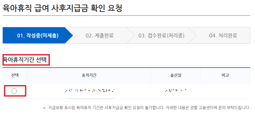 1. 고용보험 홈페이지 접속 > 모성 보호 탭 > 간편 로그인 후 > 육아휴직급여 사후지급금 확인 요청 클릭