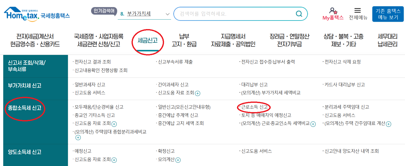 1. 홈택스 홈페이지 > 세금신고 > 종합소득세 신고 > 근로소득 신고 들어가기