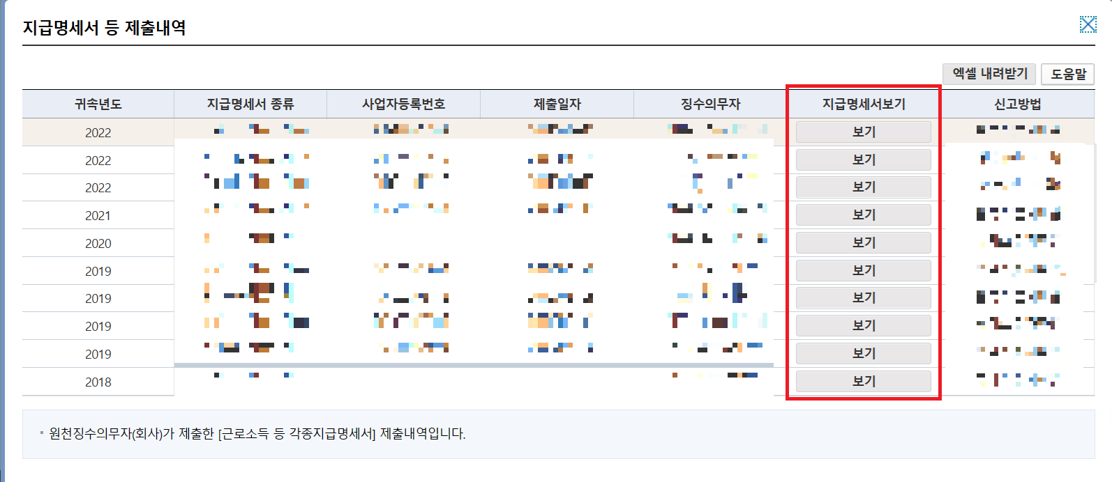 3. 현직장부터 전 직장 원천징수 영수증까지 다 볼 수 있다.