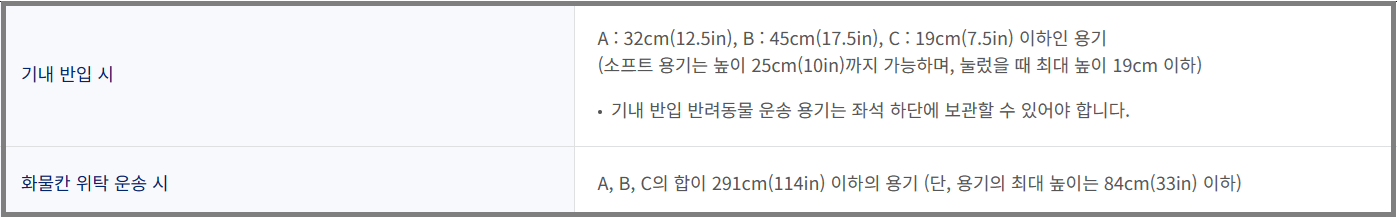 - 기내반입용: 최대 반려동물 포함 된 운송용기 무게의 합이 7kg 이하인 경우 가로, 세로, 높이의 합이 10cm 이하, 가로 최대 37cm, 높이 23cm 이하인 용기