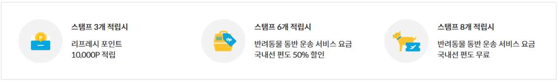 - 스탬프 6개 적립시적립 시 국내선 1구간 50% 할인, 12개 적립 시 국내선 무료운송 또는 국제선 1구간 50% 할인 적용 등의 혜택