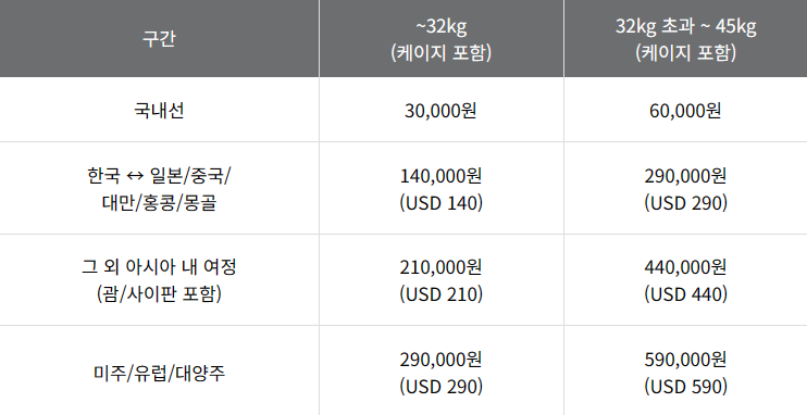 ※ 운송방식 (기내 반입, 화물칸 운송)에 따른 요금은 동일하다.